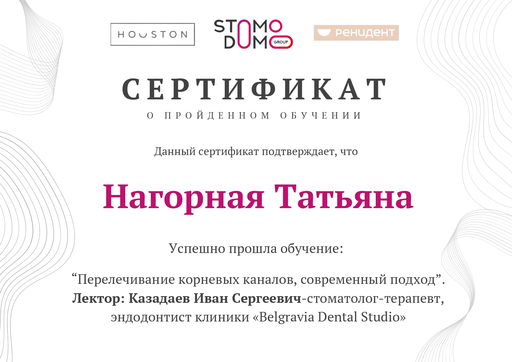 Нагорная Татьяна Александровна — стоматолог-терапевт высшей квалификационной категории, о чём свидетельствует протокол №10 территориальной аттестационной комиссии министерства здравоохранения Хабаровского края от 05.04.2018.